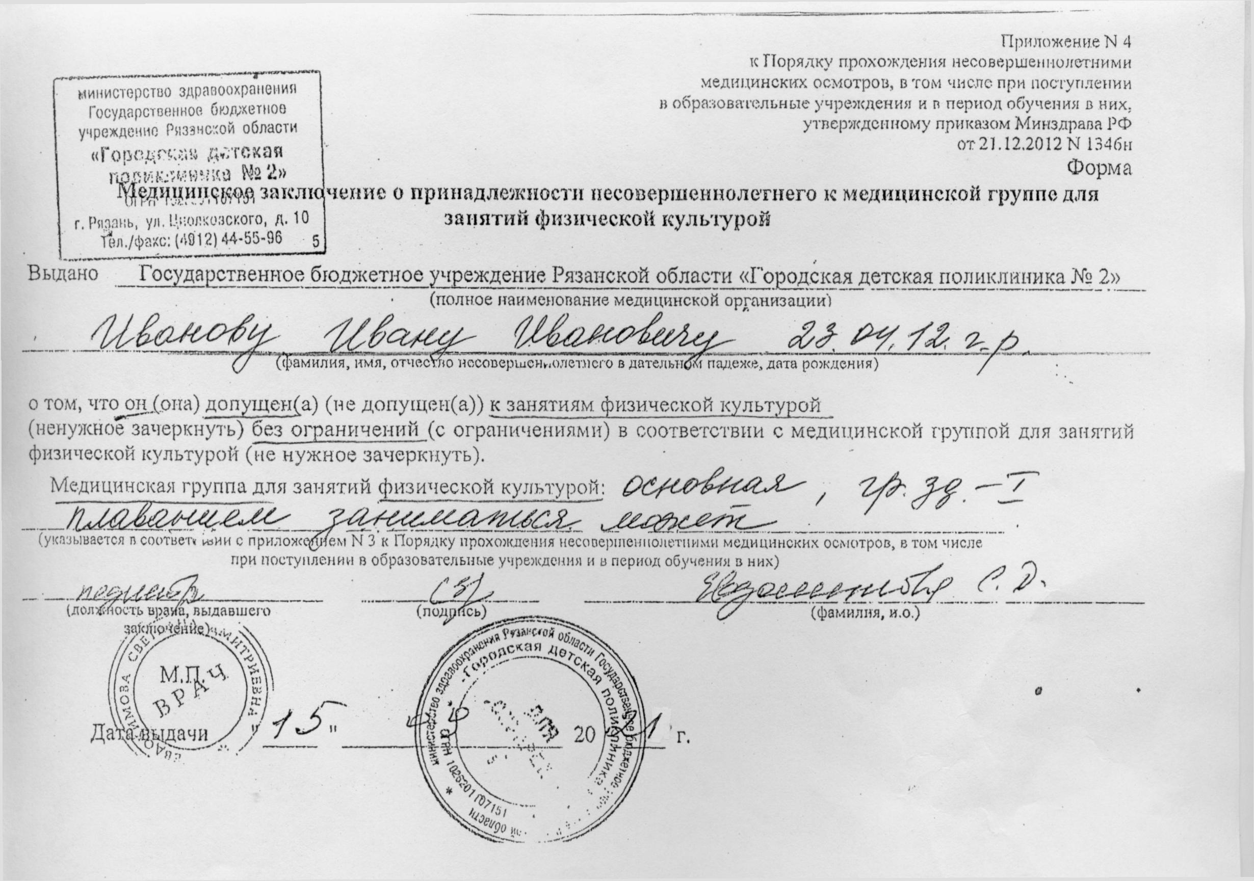 Для посещения физкультурно-оздоровительных объединений различной направленности (спортивных секций, тренажерных залов, залов аэробики) детям и взрослым необходимо предоставить медицинскую справку установленного образца из мед. учреждения по месту жительства от педиатра или терапевта о состоянии здоровья. В справке детям необходимо указать группу здоровья и физкультурную группу!