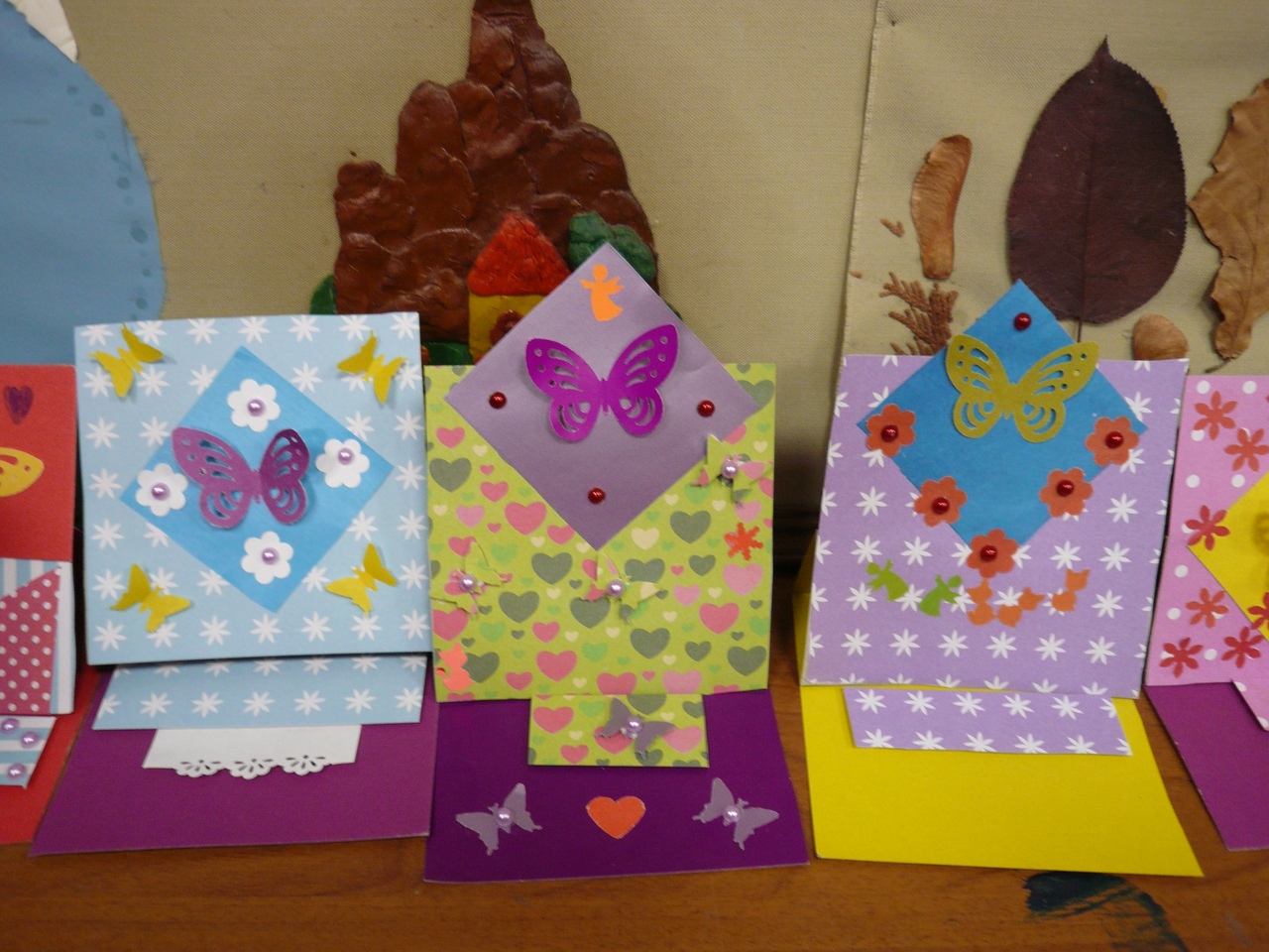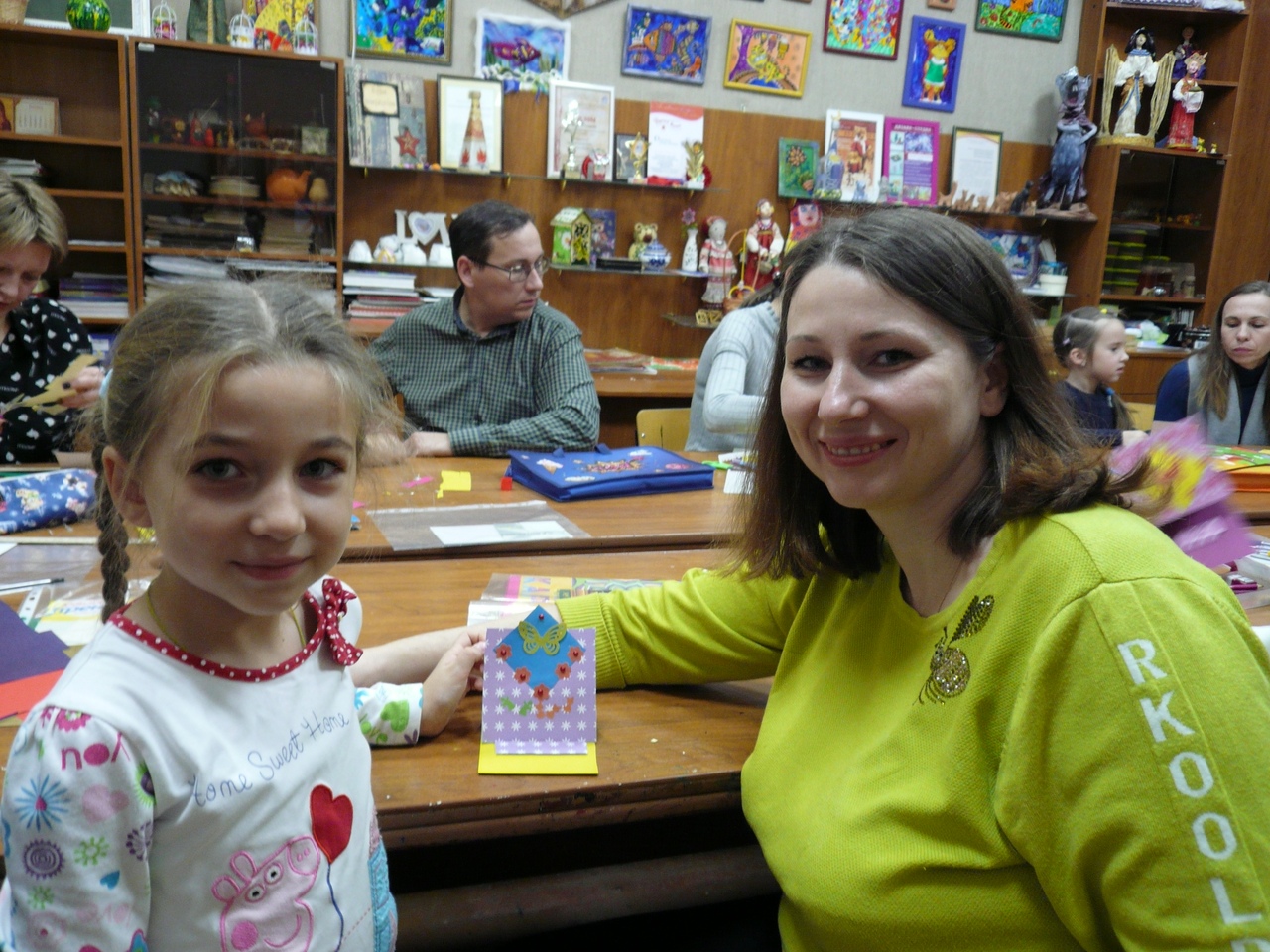 Папы и мамы вместе с дочками сделали объёмную открытку из цветной бумаги и картона с использованием фигурных дыроколов и декоративных элементов.