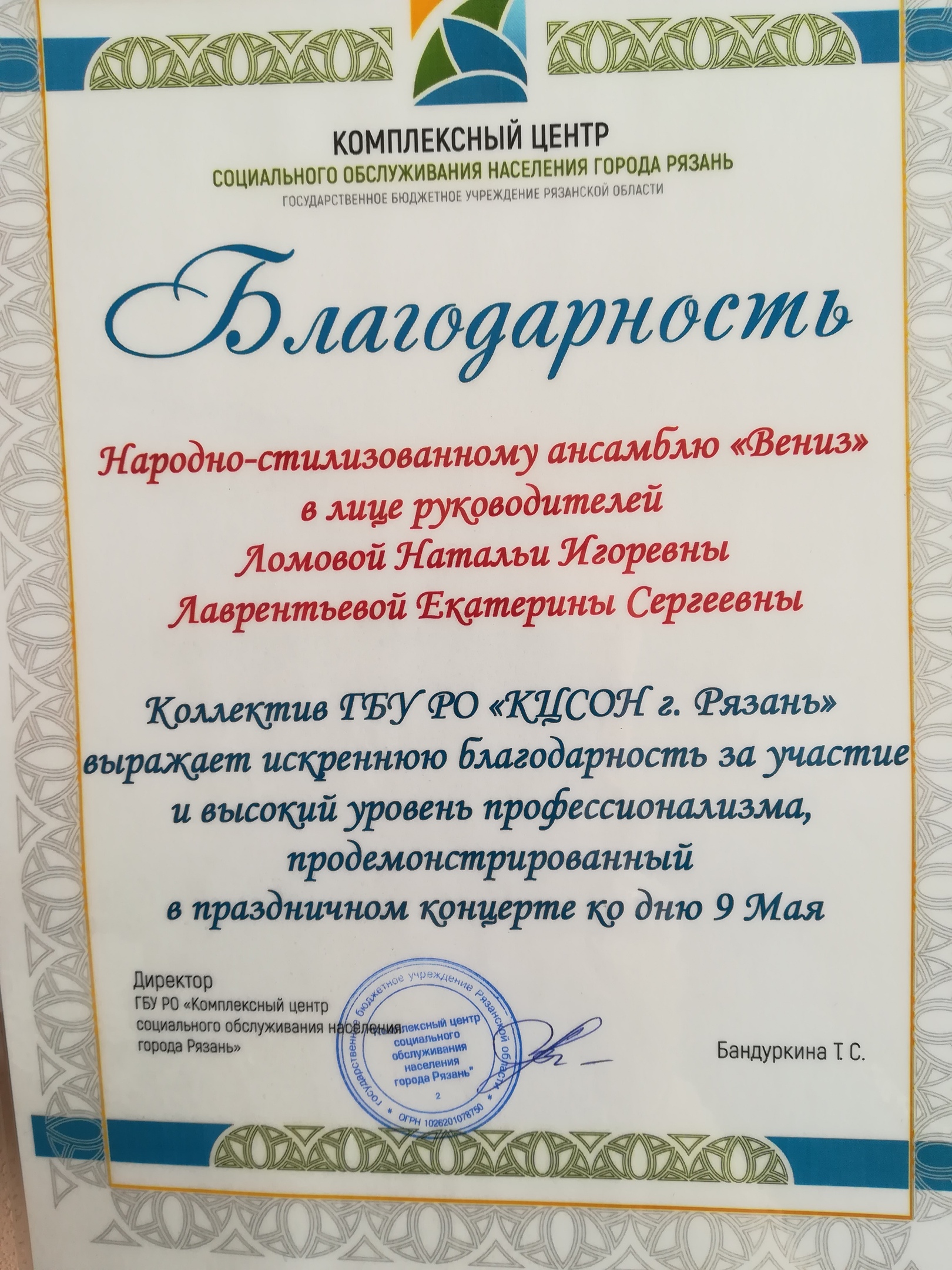 Ансамблю была выражена Благодарность в лице директора Бандуркиной Т. С., но самой главной наградой были аплодисменты от зрителей.... Спасибо за Победу!