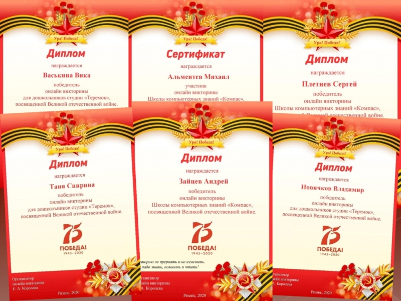 Завершились Онлайн-викторина для дошкольников студии комплексного обучения "Теремок", а также Победная онлайн викторина для учащихся Школы компьютерных знаний "Компас", посвященные Великой Отечественной войне. Все победители награждены дипломами, а участники - сертификатами. Ура! Победа!