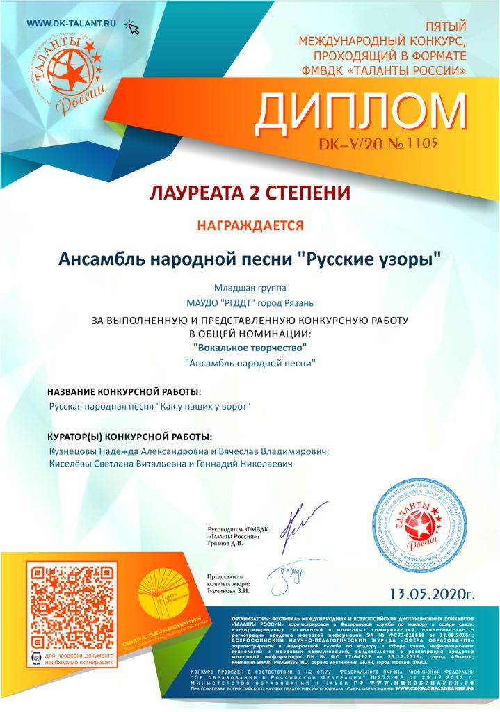 Ансамбль «Русские узоры» несмотря на самоизоляцию, принял участие в 5 международном конкурсе «Таланты России».