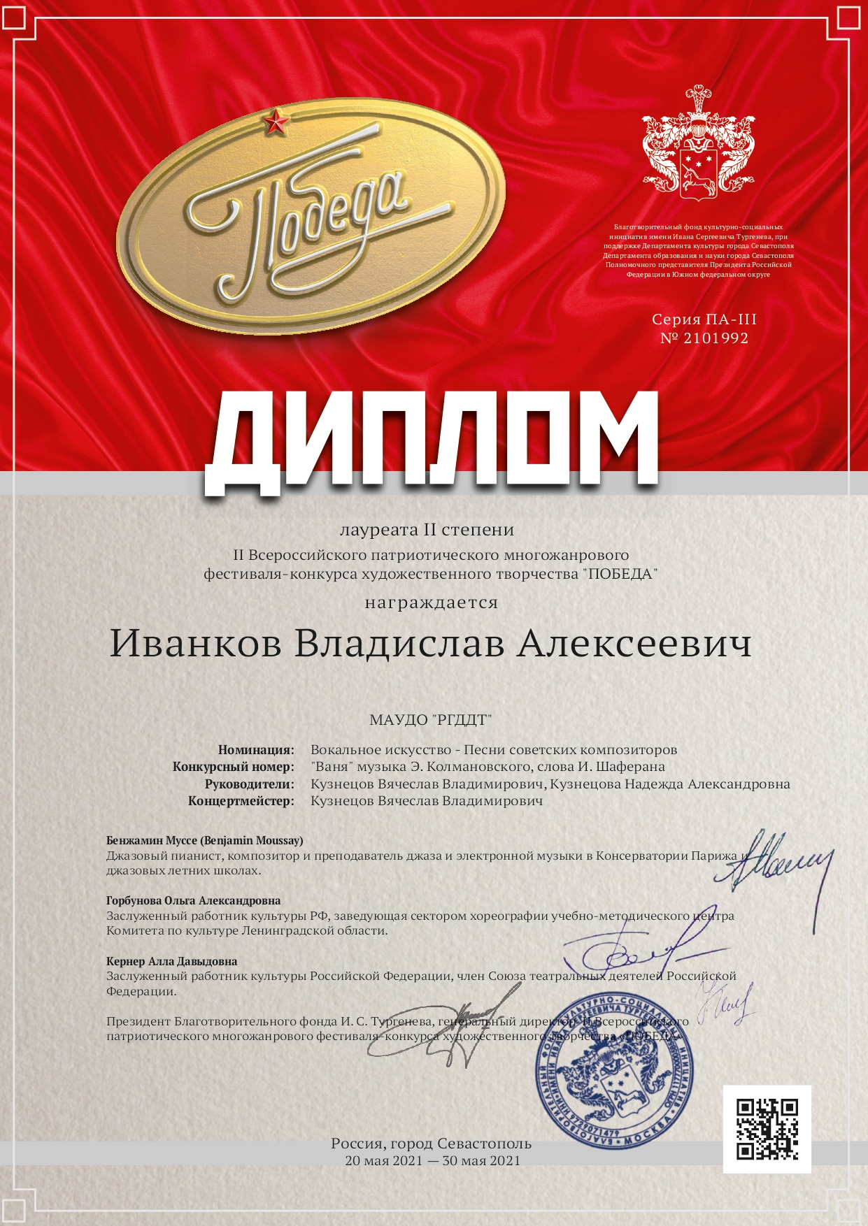 Подведены итоги II Всероссийского патриотического многожанрового фестиваля-конкурса художественного творчества «ПОБЕДА», проходившего в городе Севастополь в дистанционном формате. Солист ансамбля народной песни «Русские узоры» - Иванков Владислав стал Лауреатом 2 степени, исполнив песню Э. Колмановского и  И. Шаферана  «Ваня».