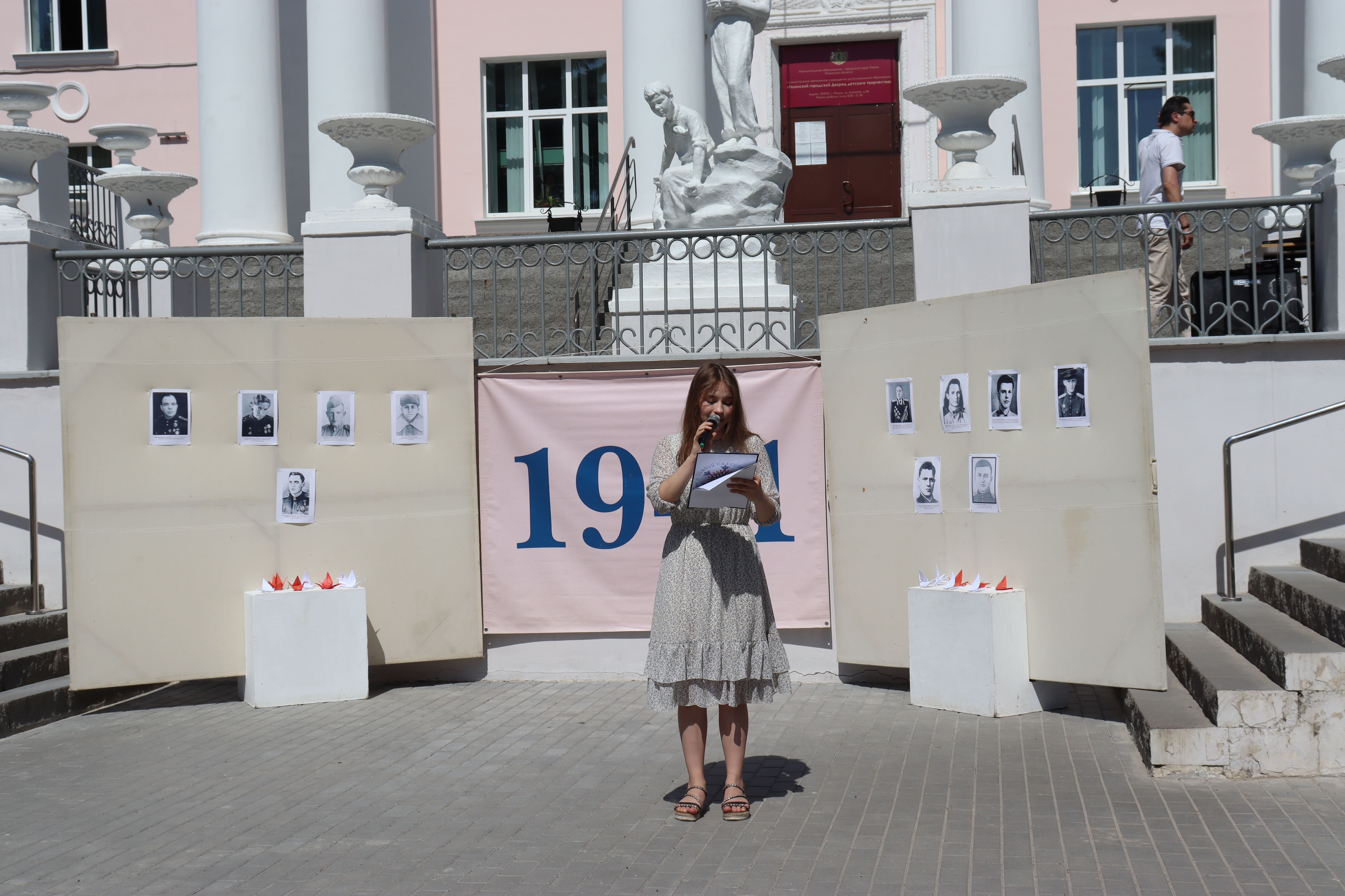 22 июня в муниципальном автономном учреждении дополнительного образования «Рязанский городской Дворец детского творчества» состоялось мероприятие «День памяти», посвященное 80-ой годовщине начала Великой Отечественной войны. Воспитанники Дворца вместе с педагогами подготовили концертную программу. Выступили детские коллективы Дворца: театр-студия «Экспромт», студия эстрадного вокала «Новые голоса», поэтический театр «Вдохновение», студия эстрадного вокала «L-Kids music». Ребята рассказали об улицах, названных в честь Рязанских героев, прочитали стихотворения и прозу, исполнили музыкальные композиции на патриотическую тему. После концертной части работали интересные познавательные площадки-станции с мастер-классами, изготовлением поделок, выставкой книг музея рукописной книги, написанием картин и созданием мультфильма о мире на Земле. Больше фотографий вы можете посмотреть здесь.