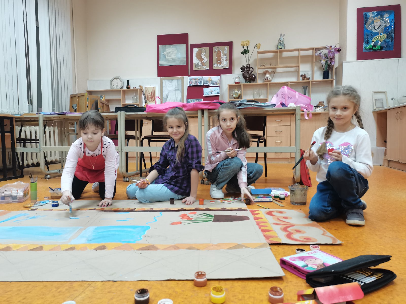 Для работы художникам понадобился картон в виде старинных окошек со ставнями, который учащиеся расписали, всматриваясь на страницы книг с деревянной Рязанью.