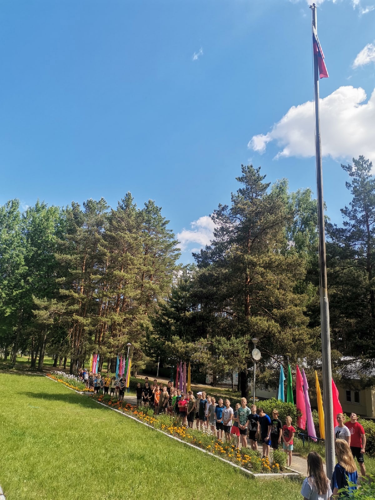 День России в лагере "Смена" открылся торжественной линейкой, на которой был поднят флаг Российской Федерации и исполнен гимн. Чтецы КСДП "Лидер" исполнили стихи о символах России, специально для праздника отряд ансамбля танца "Импульс" подготовил композицию "Аист - на крыше, мир - на земле". Весь лагерь провозгласил троекратное ура нашей любимой стране! В программу праздничных дней также вошли конкурс рисунка на асфальте, выставка плакатов “Моя Россия", викторина "Душа всей России - Рязань", футбольные матчи, кросс и, конечно,"Танцы в русском стиле"!