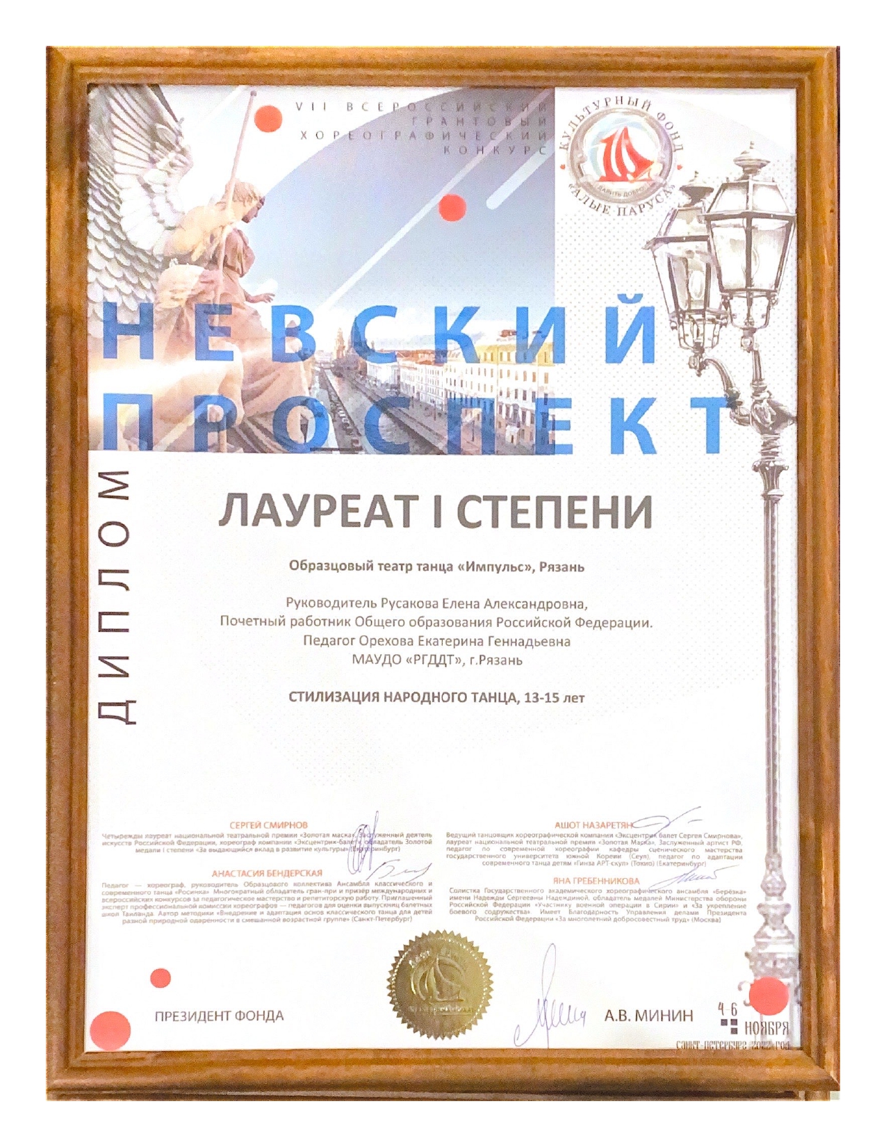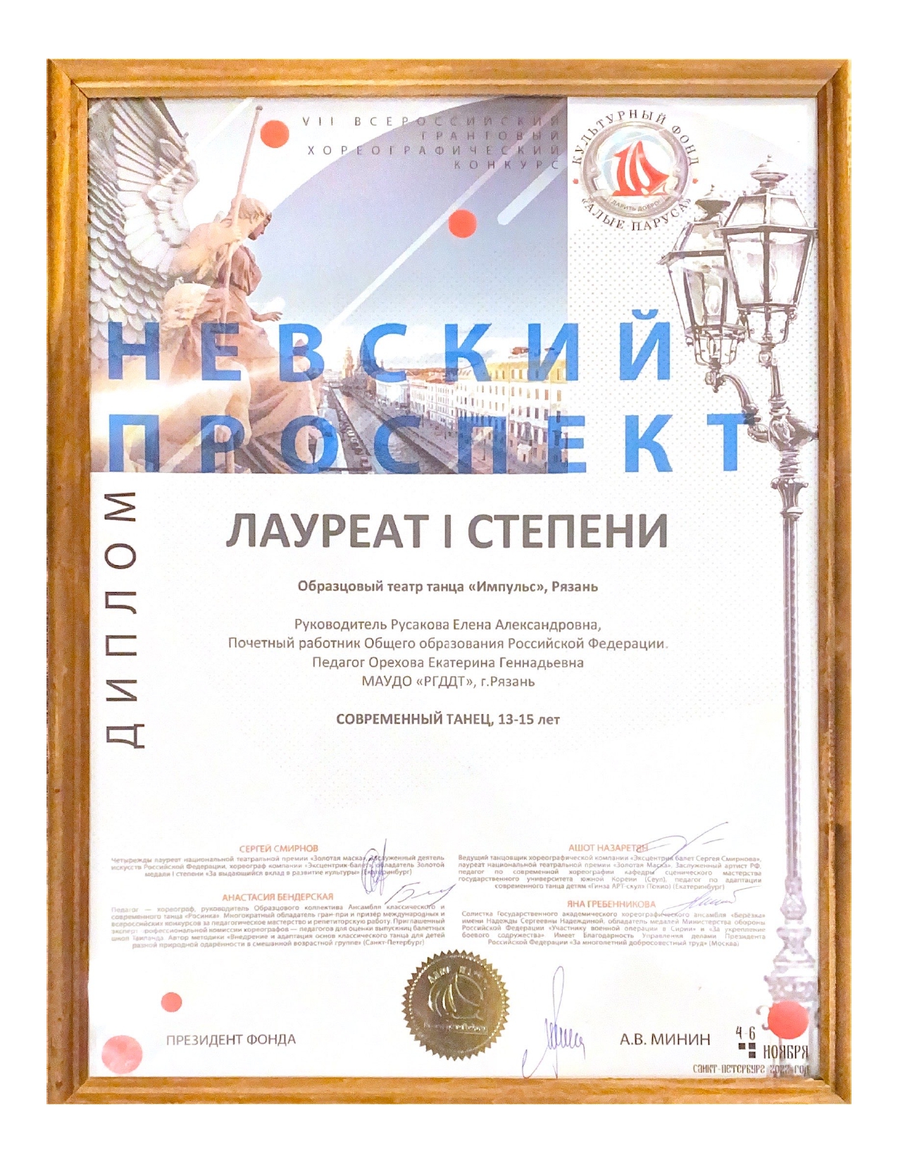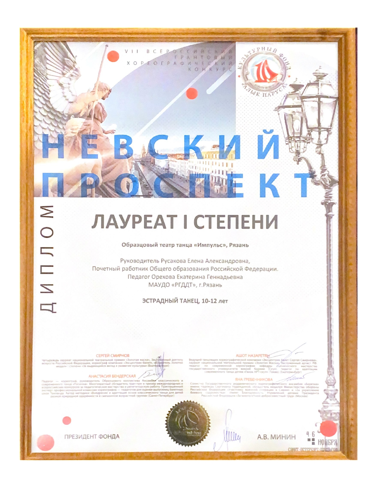 Образцовый театр танца «Импульс» Двроца детского творчества (руководитель - Е.А. Русакова, педагог - Е.Г. Орехова) вернулся с VII Всероссийского грантового хореографического конкурса «Невский проспект», который проходил в Санкт-Петербурге с 4 по 6 ноября.