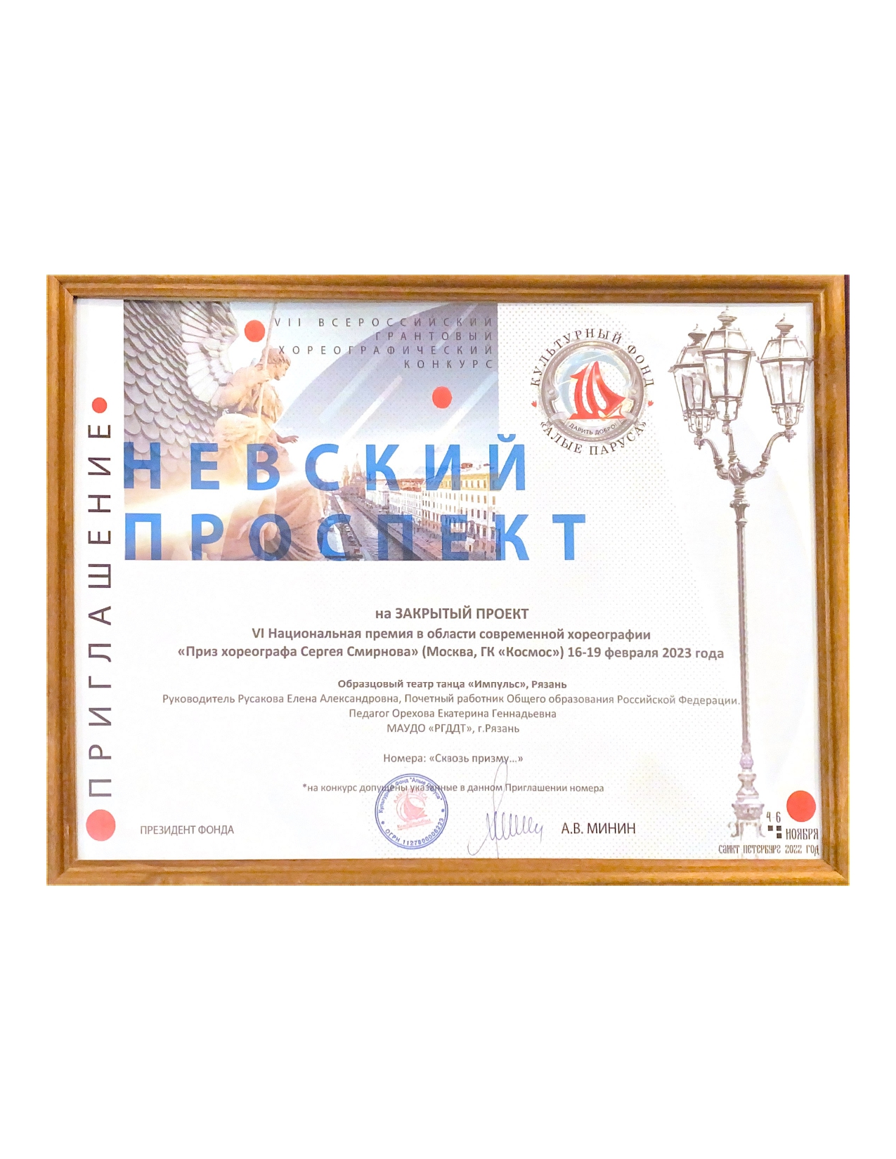Коллектив стал Лауреатом I степени в номинации «Современный танец 13-15 лет», Лауреатом I степени в номинации «Народно-стилизованный танец 13-15 лет», Лауреатом I степени в номинации «Эстрадный танец 10-12 лет». Театр танца «Импульс» получил приглашение на ЗАКРЫТЫЙ Грантовый конкурс «Кубок Победителей» среди лучших коллективов 2022-2023 уч. года с призовым фондом 1000000 рублей и приглашение на ЗАКРЫТЫЙ ПРОЕКТ VI НАЦИОНАЛЬНАЯ ПРЕМИЯ в области СОВРЕМЕННОЙ ХОРЕОГРАФИИ. Свои награды получили и руководители, и каждый участник коллектива – личную грамоту!