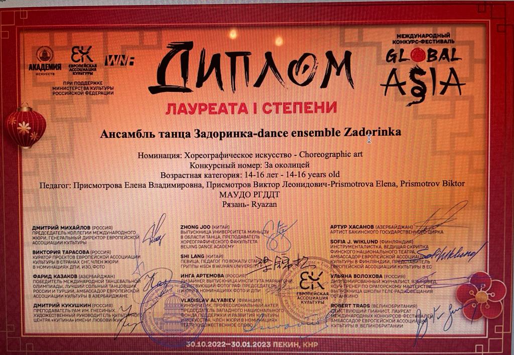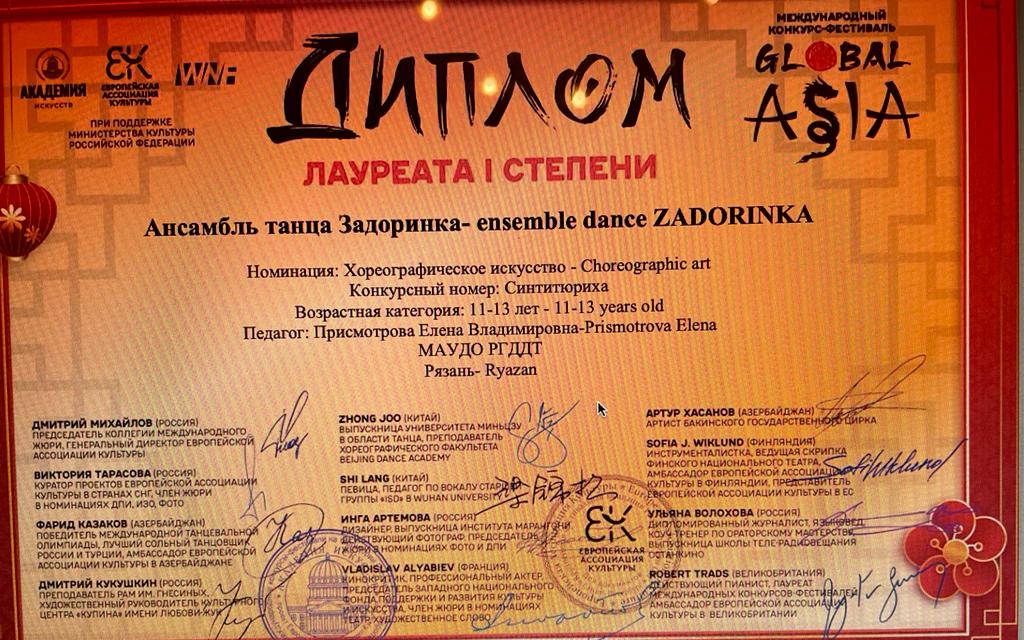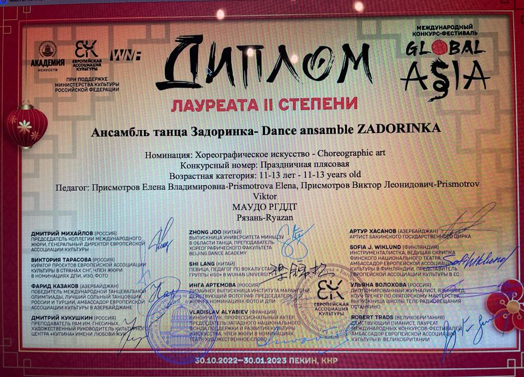 Ансамбль народного танца «Задоринка» Дворца детского творчества принимал участие в Международном конкурсе-фестивале Global Asia. По результатам конкурса ансамбль «Задоринка» стал обладателем Диплома Лауреата I степени в номинации «Хореографическое искусство» с номером «Синтитюриха» в возрастной категории – 11-13 лет; Диплома Лауреата II степени в номинации «Хореографическое искусство» с номером «Праздничная плясовая» в возрастной категории – 11-13 лет; Диплома Лауреата I степени в номинации «Хореографическое искусство» с номером «За околицей» в возрастной категории – 14-16 лет.