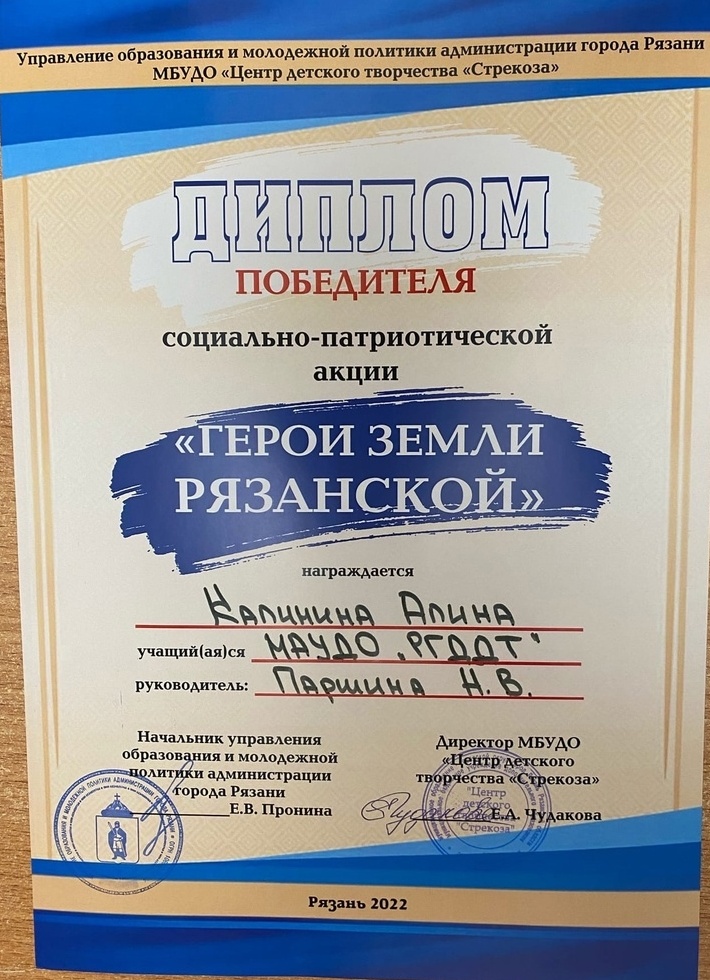 В течение декабря 2022 года в городе Рязани в заочном формате проводилась социально-патриотическая акция «Герои земли рязанской». Организатором акции выступил МБУДО «Центр детского творчества «Стрекоза», учредителем - управление образования и молодежной политики администрации города Рязани.