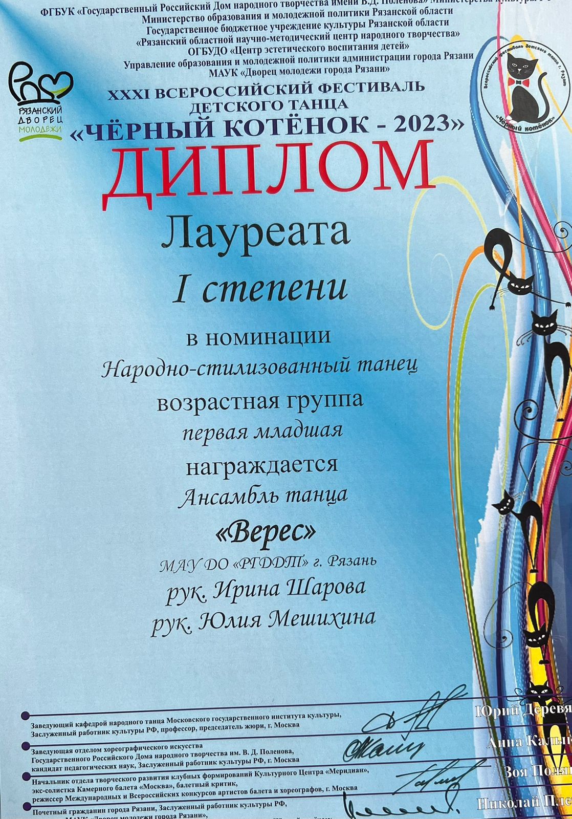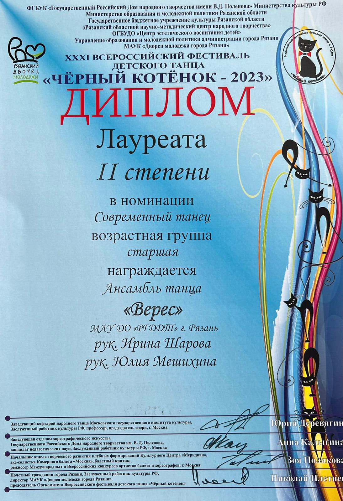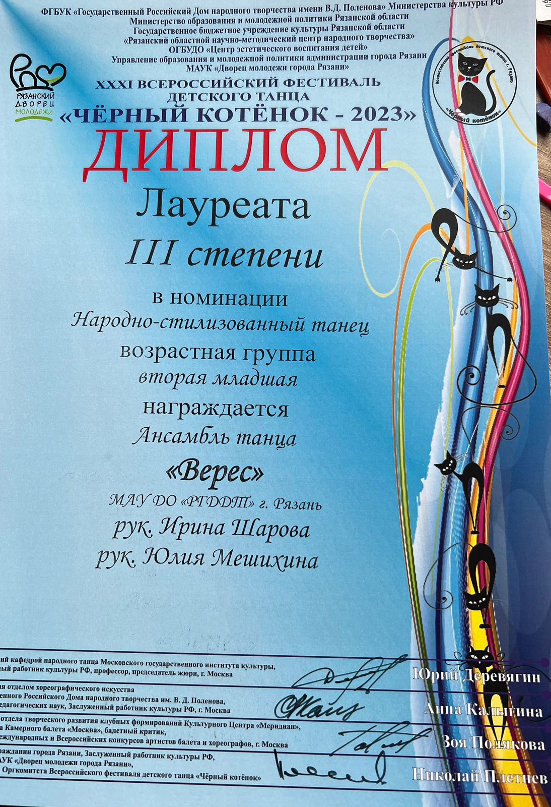 24-25 февраля 2023 года ансамбль танца «Верес» (рук. И.И. Шарова, пед. Ю.Г. Мешихина) и театр современного танца «Импульс» (рук. Е.А. Русакова, пед. Е.Г. Орехова) Рязанского городского Дворца детского творчества приняли участие в XXXI Всероссийском фестивале детского танца «Черный котенок - 2023» (МАУК «Дворец молодежи города Рязани»). Учредителями конкурса являются Министерство культуры РФ, ФГБУК «Государственный Российский Дом народного творчества имени В.Д. Поленова», министерство образования и молодежной политики Рязанской области, ГБУ «Рязанский областной научно-методический центр народного творчества», ОГБУДО «Центр эстетического воспитания детей», управление образования и молодежной политики администрации города Рязани.