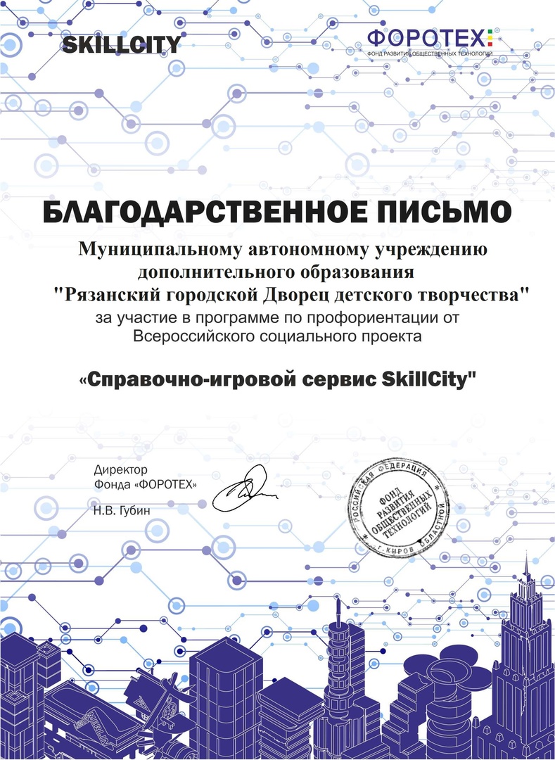 Администрация Рязанского городского Дворца детского творчества благодарит #SkillCity за интересные и полезные материалы к занятиям, сотрудничество и возможность познакомить детей с миром информационных технологий.