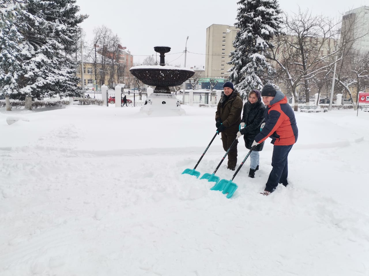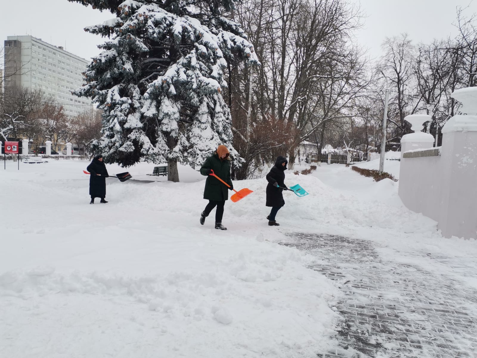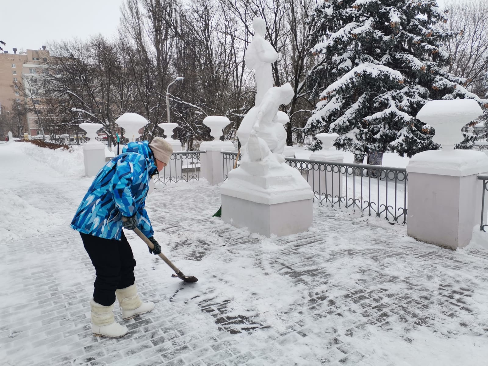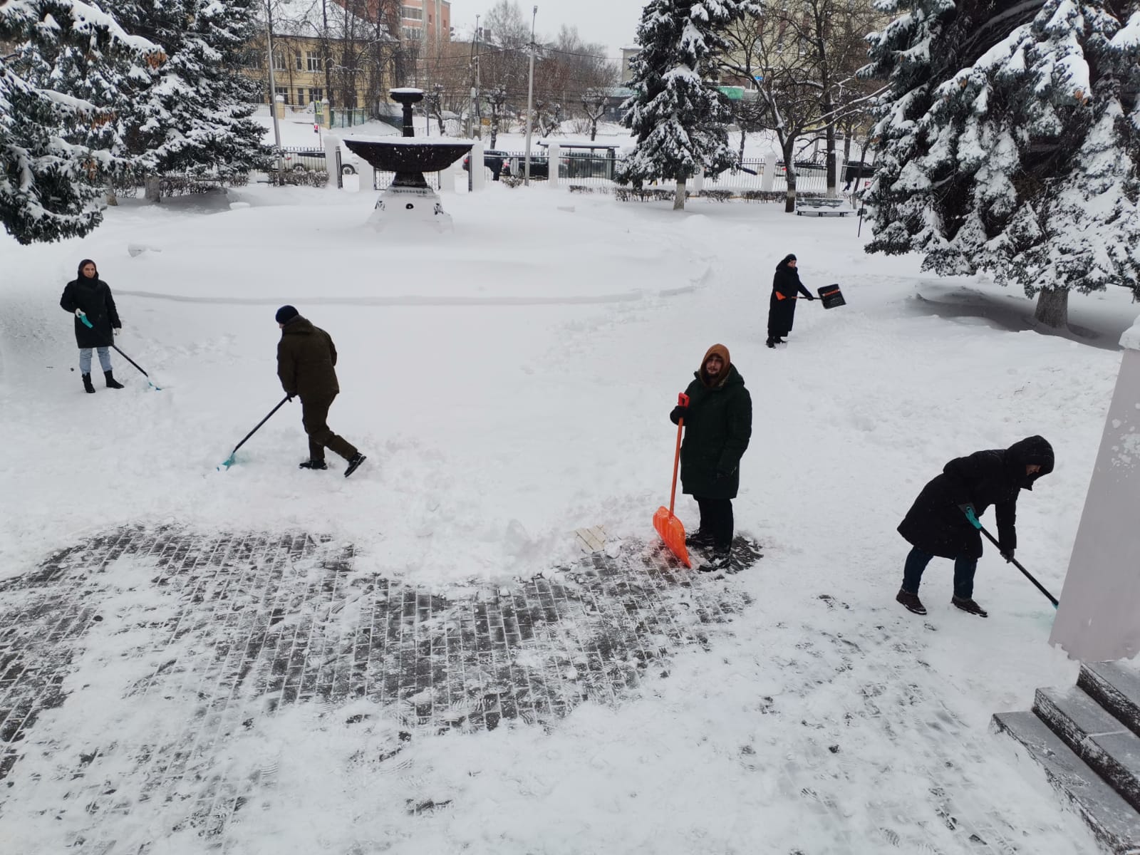 Входные зоны, дорожки – всё приводится в порядок с помощью техники и, конечно, незаменимых в борьбе со снегом лопат.