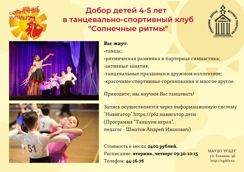 Главная Новости Добор детей 4-5 лет в танцевально-спортивный клуб "СОЛНЕЧНЫЕ РИТМЫ" Добор детей 4-5 лет в танцевально-спортивный клуб "СОЛНЕЧНЫЕ РИТМЫ" 25.01.2024