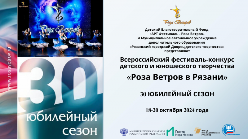 Муниципальное автономное учреждение дополнительного образования «Рязанский городской Дворец детского творчества» совместно с Детским Благотворительным Фондом «Арт-Фестиваль – Роза Ветров» проводит в период с 18 августа по 07 октября 2024 года прием заявок на Всероссийский фестиваль-конкурс детского и юношеского творчества