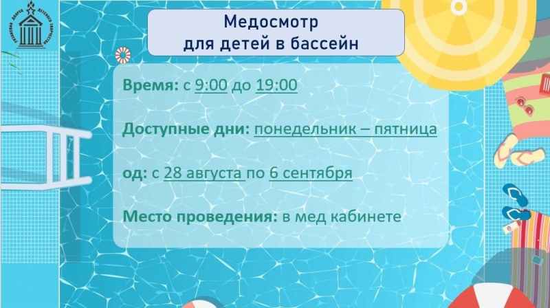 С 28 августа по 6 сентября проводится обязательный детский медосмотр перед посещением бассейна.