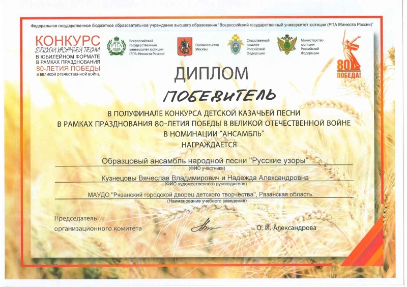 23 апреля 2025 года в Москве состоялся полуфинал Центрального федерального округа юбилейного конкурса детской казачьей песни. Мероприятие было приурочено к 80-летию Победы в Великой Отечественной войне и прошло при поддержке Министерства юстиции Российской Федерации, Следственного комитета Российской Федерации, Правительства Москвы и Всероссийского государственного университета юстиции (РПА Минюста России).