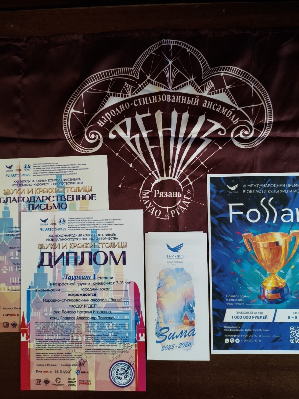 Народно-стилизованный ансамбль «ВЕНИЗ» Дворца детского творчества представил на конкурсный показ фрагмент музыкально-игровой композиции «Солдатская сказка» и был награжден Дипломом Лауреата I степени, приглашением на VI Международную премию в области культуры и искусств «Fossart», которая пройдет с 5 по 8 марта в г. Москва и приглашением на конкурсы-фестивали в г. Санкт-Петербург в 2026 г.