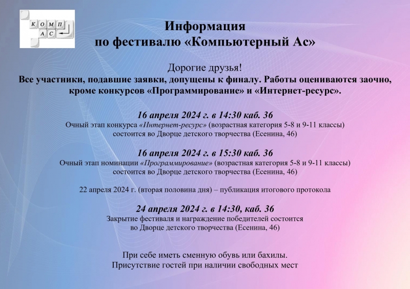 Главная Новости Информация для участников фестиваля "Компьютерный Ас" Информация для участников фестиваля "Компьютерный Ас" 12.04.2024