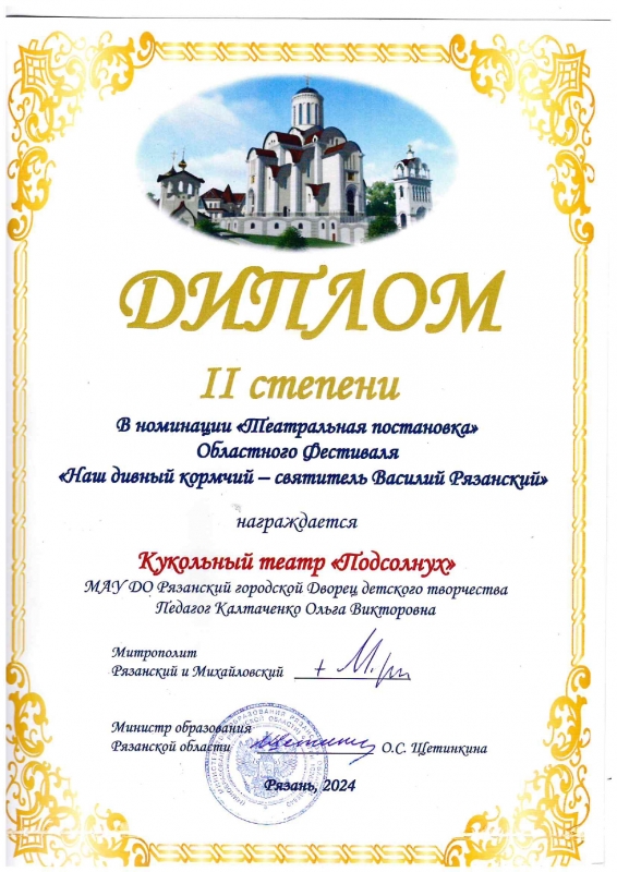 Кукольный театр «Подсолнух» (руководитель Ольга Викторовна Калтаченко, МАУДО «Рязанский городской Дворец детского творчества»), стал призером областного фестиваля –конкурса «Наш дивный кормчий - Василий Рязанский». Учредители фестиваля Министерство образования Рязанской области, Рязанская Епархия, соучредитель Рязанское региональное отделение ООО «Всероссийское педагогическое собрание». Фестиваль посвящен 1035-летию Крещения Руси. На награждении ребят приветствовали и поздравляли почетные гости: Митрополит Рязанский и Михайловский Марк, начальник управления воспитания и дополнительного образования Куликова Надежда Николаевна, начальник сектора молодежной политики управления образования и молодежной политики администрации г. Рязани Смирнова Наталья Борисовна.