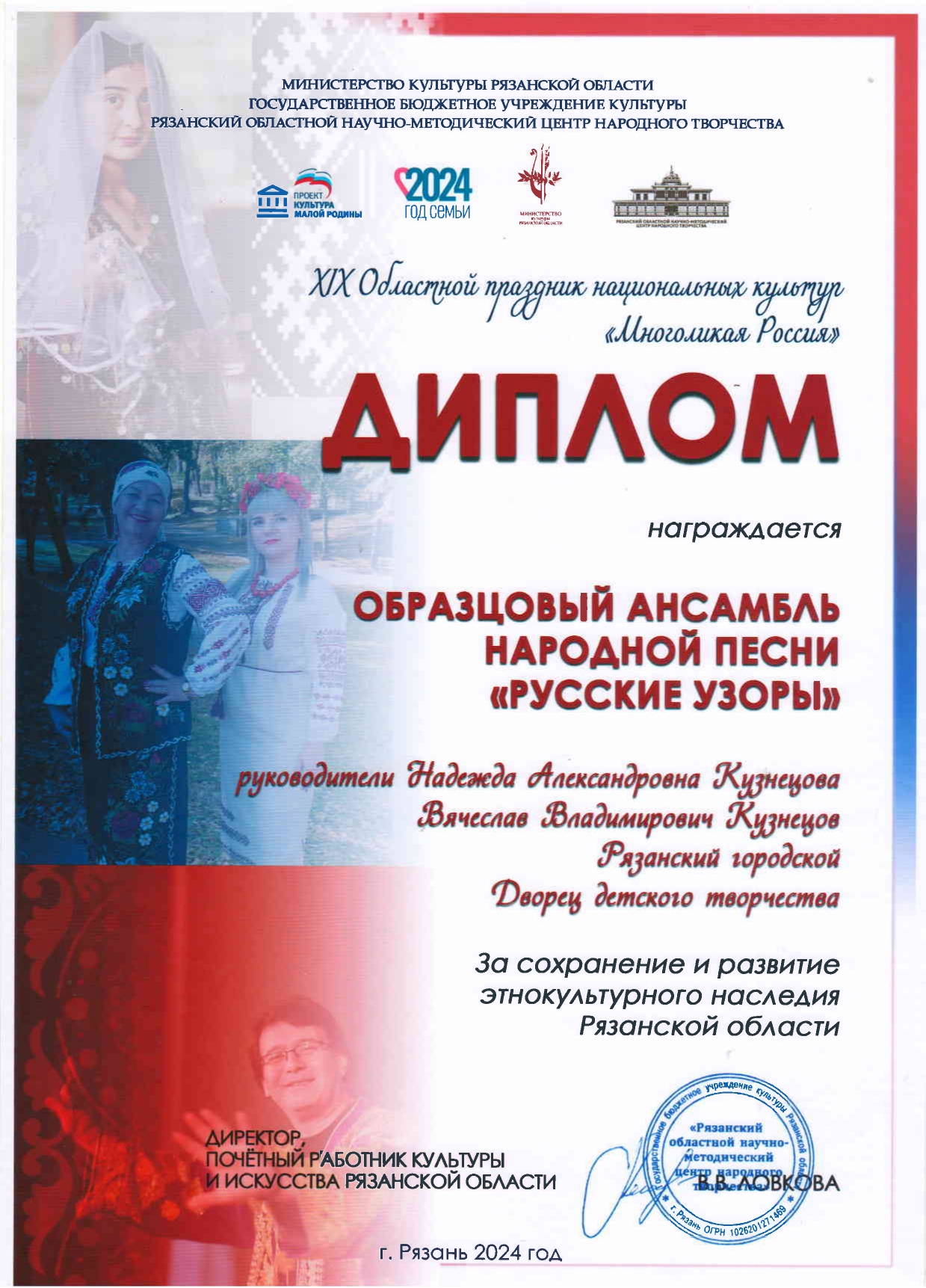 28 сентября в «Рязанском областном научно-методическом центре народного творчества» состоялся областной праздник национальных культур «Многоликая Россия». Концертную программу своим ярким выступлением открыл Образцовый ансамбль народной песни «Русские узоры» (педагоги Вячеслав Владимирович и Надежда Александровна Кузнецовы) Рязанского городского Дворца детского творчества.