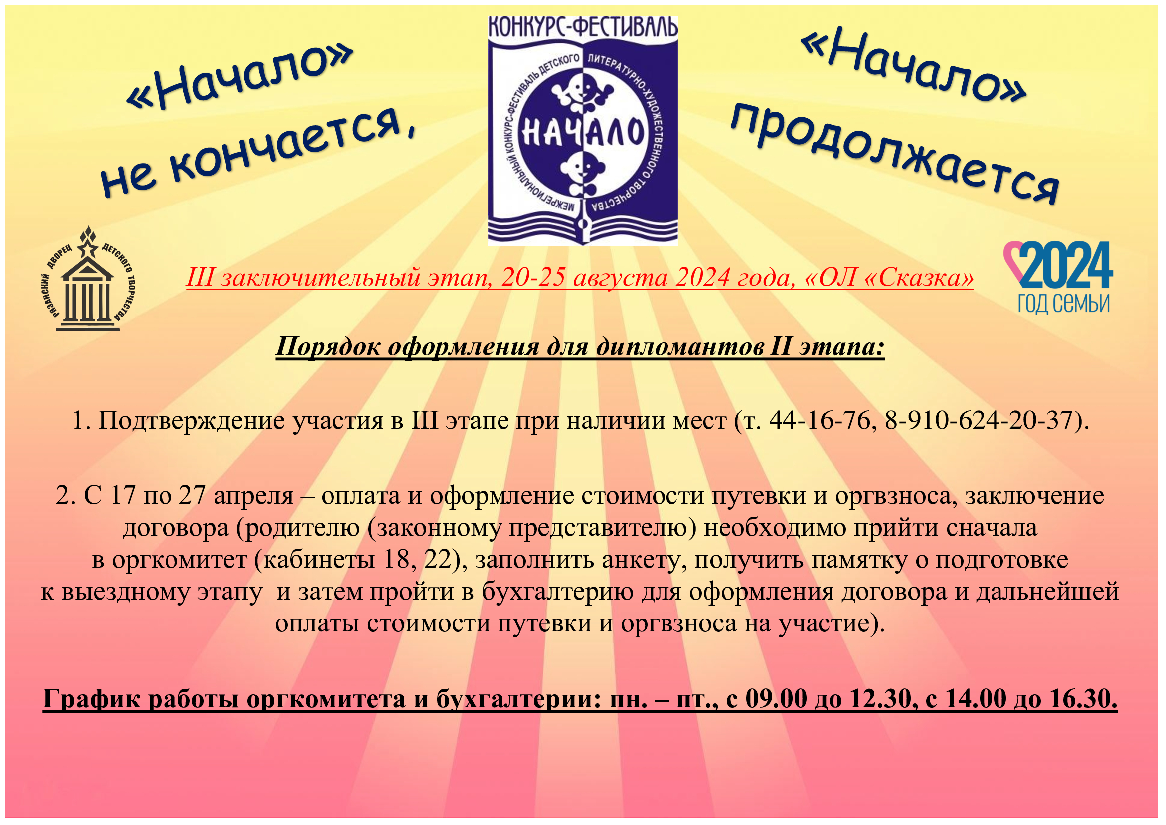Продолжается регистрация и оформление победителей и дипломантов на участие в  III заключительном этапе XXVIII межрегионального конкурса-фестиваля детского литературно-художественного творчества «Начало», который будет проходить с 20 по 25 августа 2024 года в ОЛ «Сказка» (п. Солотча).
