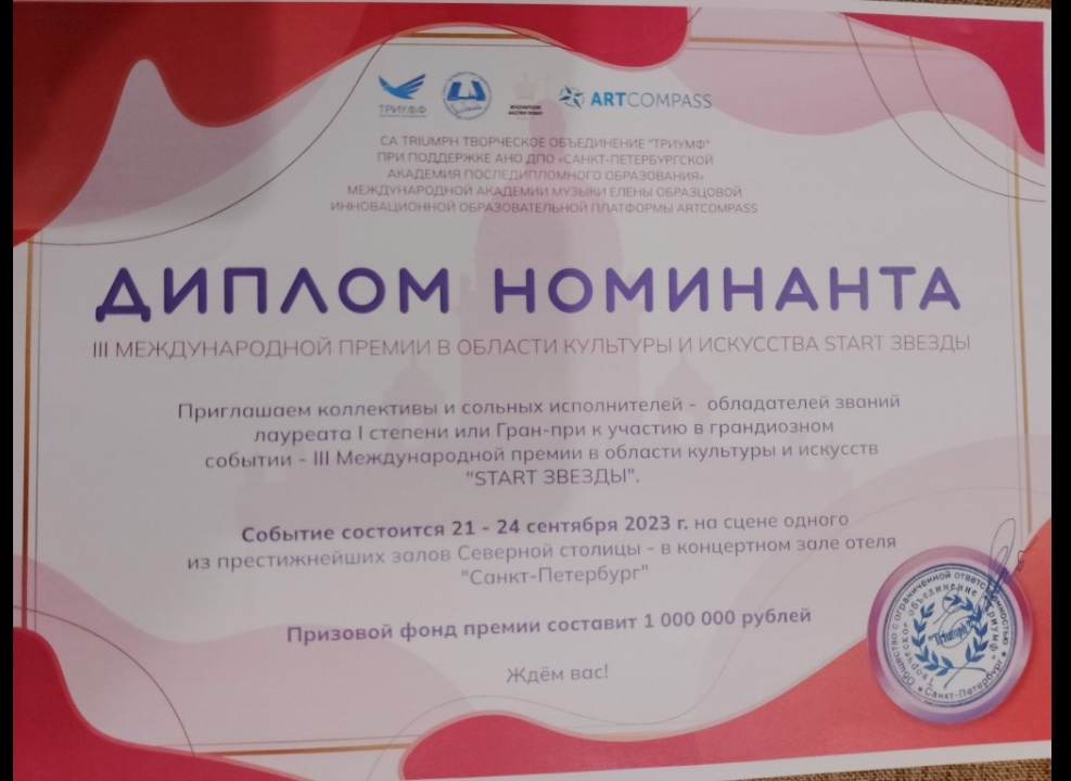 Солист ансамбля Куликов Егор стал Лауреатом I степени, получил специальный приз от жюри «За высокий уровень исполнительского мастерства» и стал номинантом Международной премии в области культуры и искусства START.