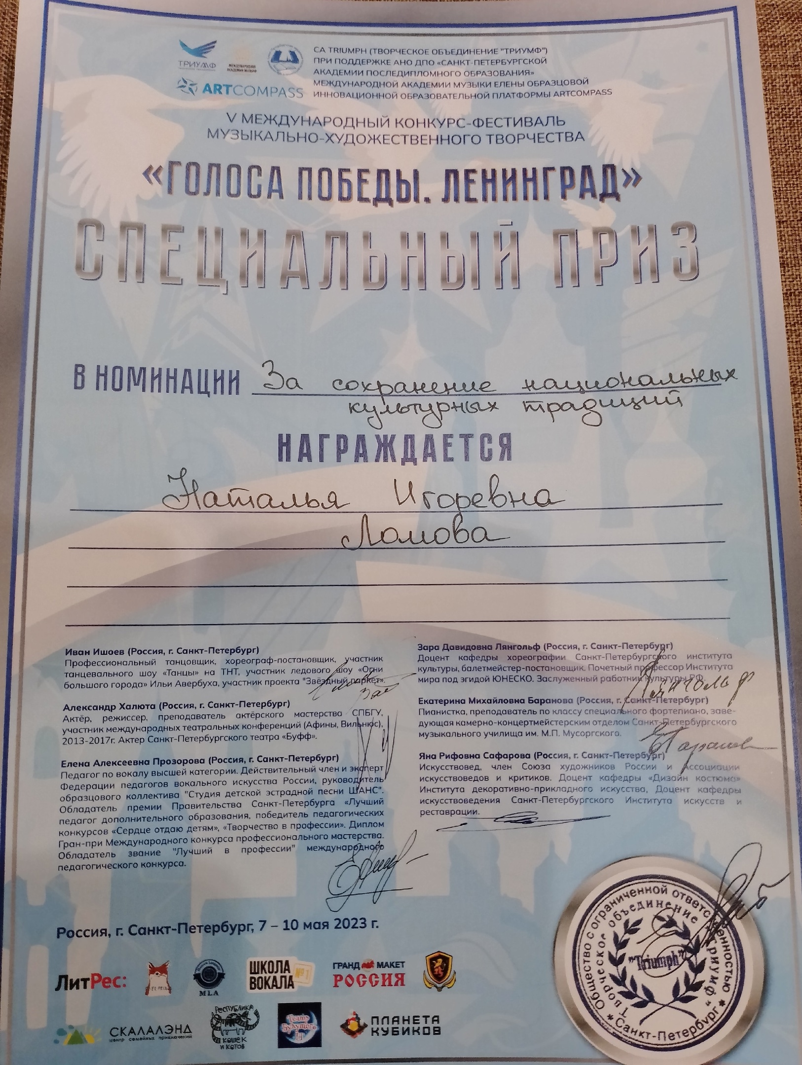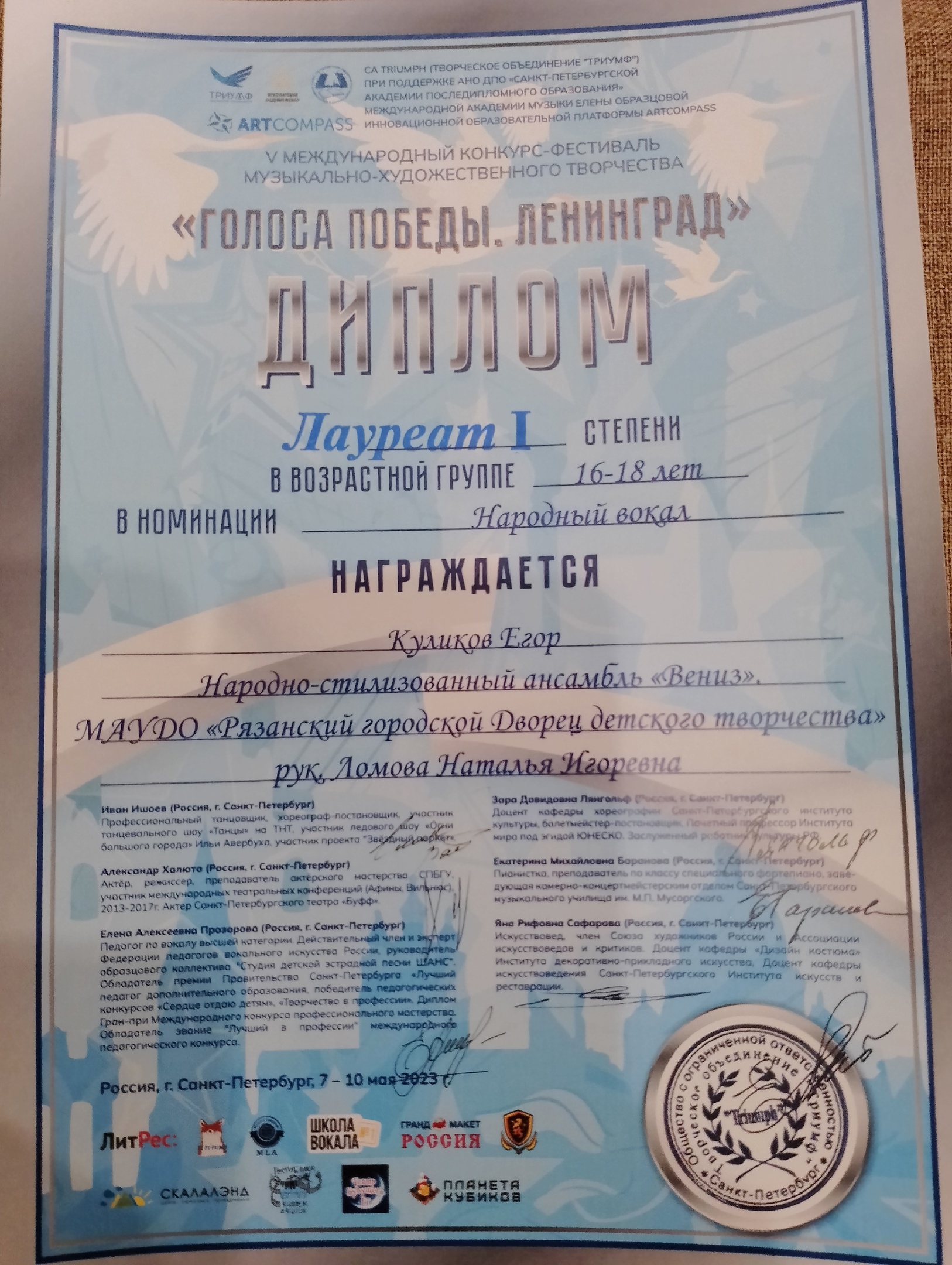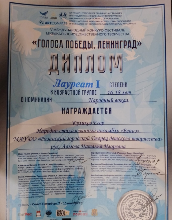 С 8 по 10 мая в г. Санкт-Петербург состоялся V Международный конкурс-фестиваль музыкально-художественного творчества «Голоса Победы. Ленинград», организованный Творческим объединением «Триумф» при поддержке АНО ДПО Санкт-Петербургской Академии последипломного образования, Международной Академии Музыки Елены Образцовой, Инновационной образовательной платформы ARTCOMPASS