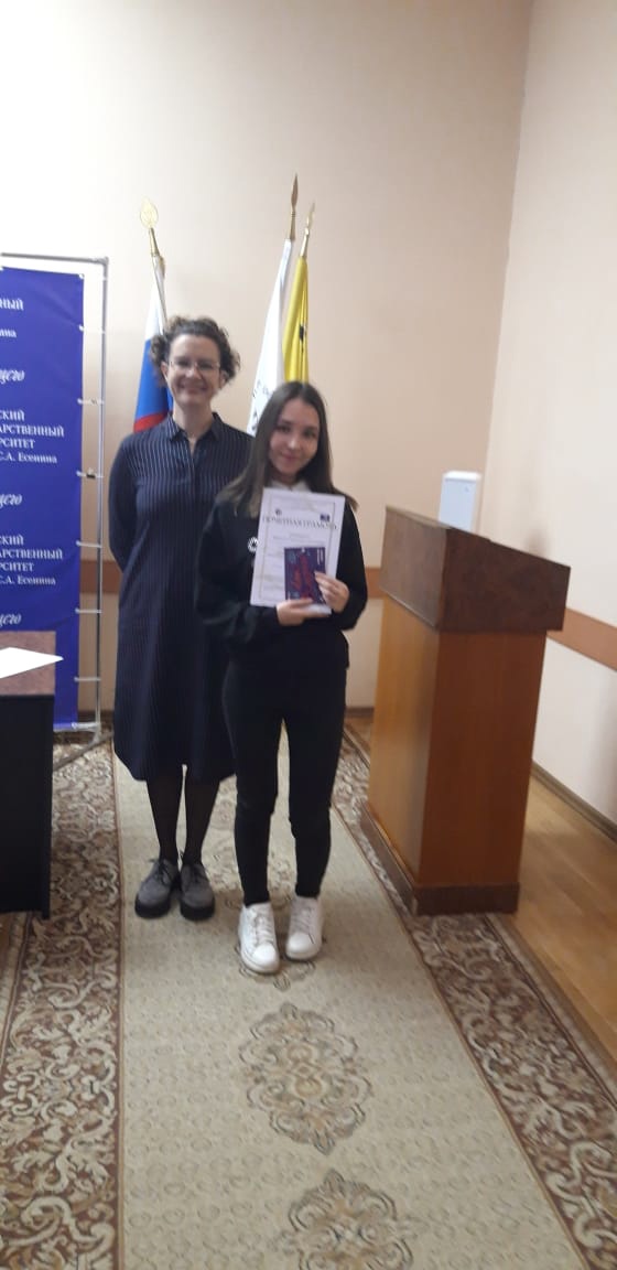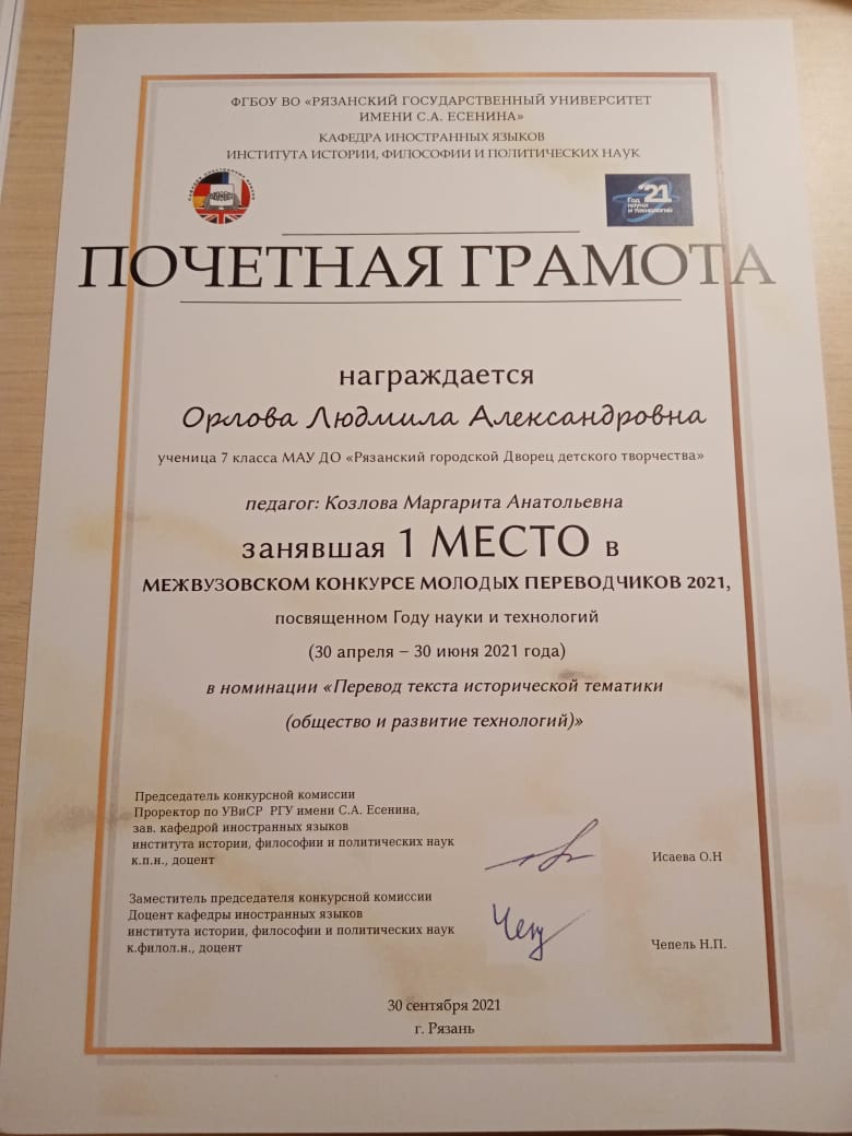 В Международный день переводчика в конференц-зале Рязанского государственного университета имени С.А. Есенина состоялось награждение победителей межвузовского конкурса молодых переводчиков. Данный конкурс проводится РГУ уже более 5 лет. Его участниками могут стать студенты вузов, магистранты и школьники. В этом году в конкурсе, посвященном Году науки и технологий в России, было более восьмидесяти заявок. Среди финалистов, удостоившихся почетных грамот, стали и учащиеся «Английского клуба» МАУДО «РГДДТ». Орлова Софья заняла 1 место в номинации «Перевод текста образовательной тематики (искусственный интеллект)», рук. Козлова М.А. Орлова Людмила также была награждена грамотой за 1 место в номинации «Перевод текста исторической тематики (общество и развитие технологий)», рук. Козлова М.А. Арсенина Ангелина и Беликова Дарья заняли 2 и 3 места соответственно в номинации «Перевод текста переводческой тематики (технологии и перевод)», рук. Козлова М.А. и Никулина Е.Н.