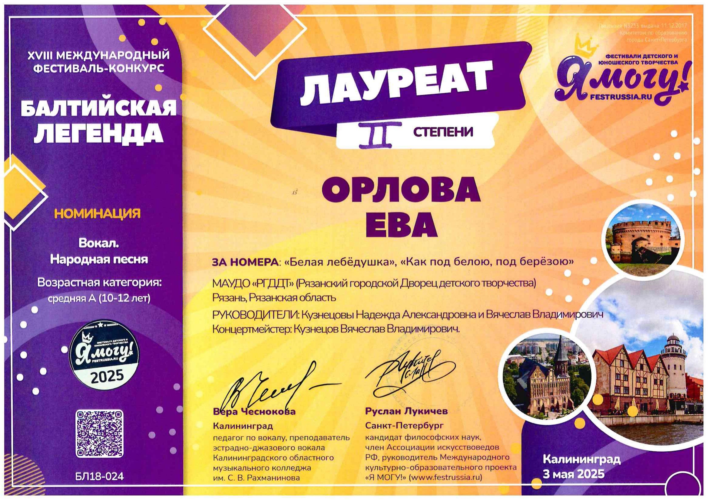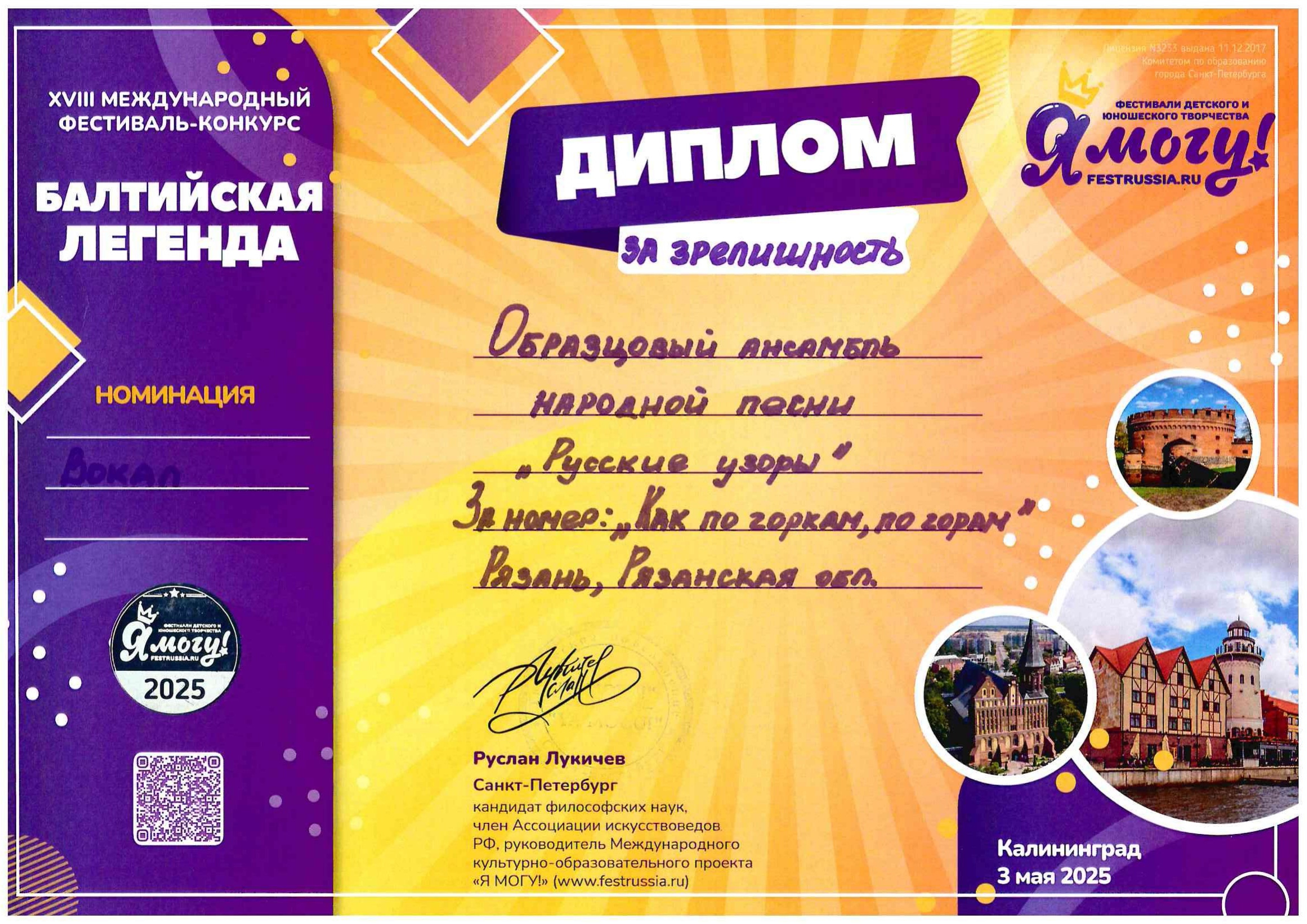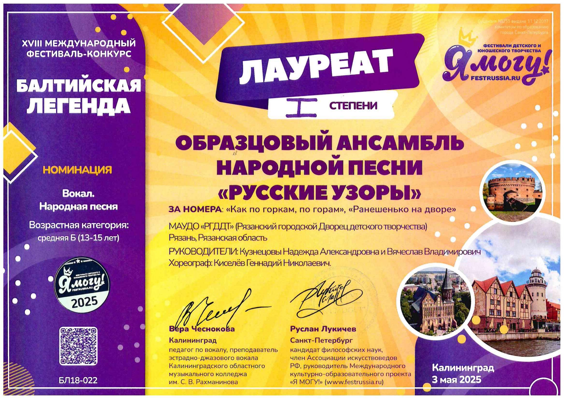 По итогам участия в "Балтийской легенде" Образцовый ансамбль народной песни "Русские узоры" стал Лауреатом 1 степени, а номер "Как по горкам, по горам" удостоен специального приза "За зрелищность и оригинальность". В конкурсе впервые участвовала Орлова Ева, которая стала Лауреатом 2 степени.