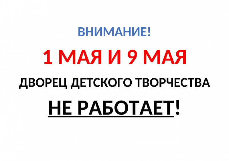 ВНИМАНИЕ! Дворец детского творчества 1 мая и 9 мая НЕ РАБОТАЕТ!