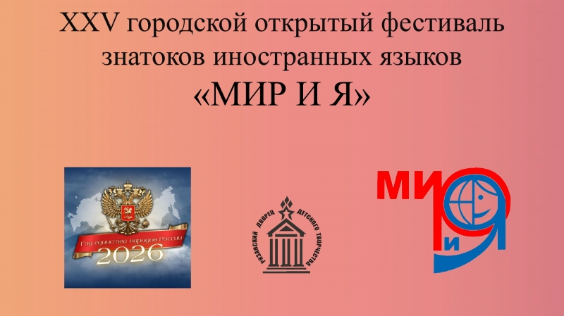 Во Дворце детского творчества стартует XXV городской открытый фестиваль знатоков иностранных языков "МИР И Я", посвященный Году единства народов России и 225-летию со дня рождения В.И.Даля. Подача заявок и работ: 14, 15, 16 и 19 января 2026 года.